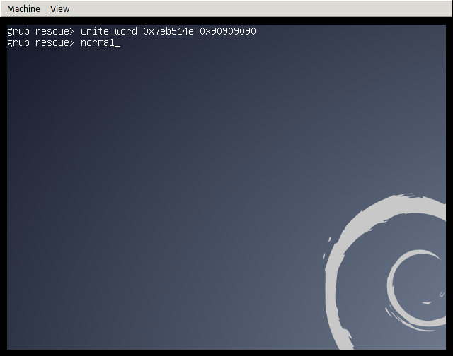 grub rescue> write_word 0x7eb514e 0x90909090 grub rescue> normal |