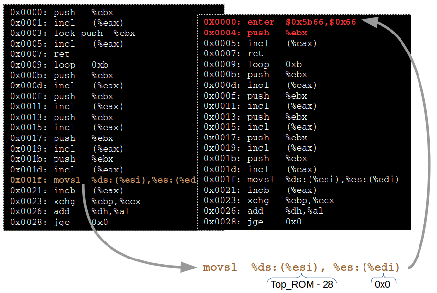If the state of the processor is the one summarized in the previous table, the code at IVT implements something like a memcpy(), which copies from the address pointed by %esi to 0x0 (to itself). Therefore, IVT is a self modifying code, and we can select the block of code that we want to copy from.