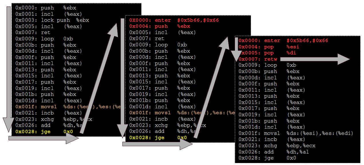 We will skip the detailed analysis of the code at: 0x00eb53e8, 0x000053e8 and 0x000000e8, because they jump to code that reboots the computer and there is no way to control the execution flow.