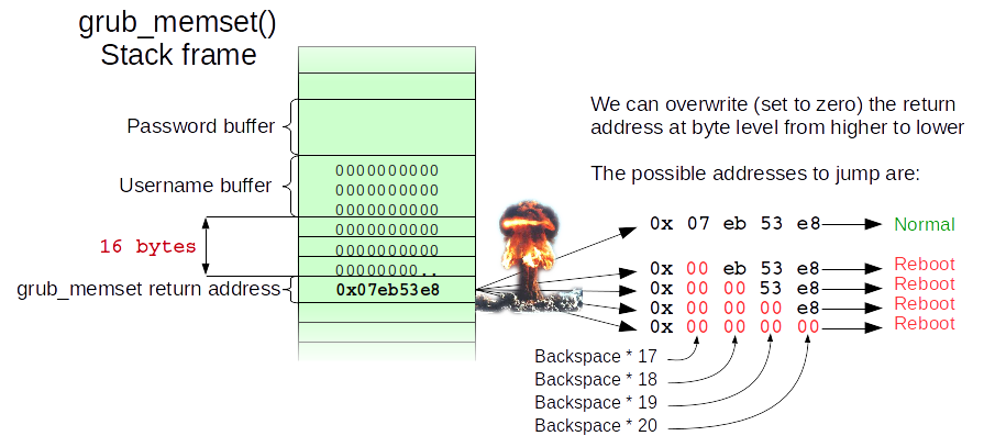 As shown in the above picture, the return address of the grub_memset() function is at a distance of 16-bytes from the username buffer. In other words, if we press the backspace key 17 times, we will overwrite the highest byte of the return address. So, instead of returning to the caller function at 0x07eb53e8 we will jump to 0x00eb53e8. When the grub_memset() ends, control flow is redirected to the the 0x00eb53e8 address causing a reboot. The same occurs if we press the backspace key 18, 19 or 20 times, in all cases the system reboots.